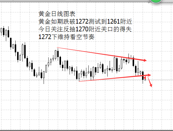 李兴淼:消息预期压制黄金破位谨慎等待反抽做空 交易日志回顾:不容易但是也是意料之中的黄金跌破1272支撑节点最低测试到了1261附近位置,实际上周一包括昨日的评论之中都是很清楚的建议说1278-80缺口下择机做空止损在1281即可,这一波的下跌也是让笔者验证了对于黄金下跌的判断了,其实也很好理解上周五黄金冲高无力周一跳