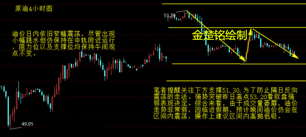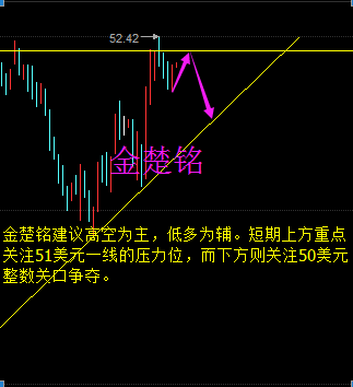 金楚铭:原油成功斩获,今日回调继续多,银价注定回调。 原油昨日下探回升。连续围绕52.10低点附近探底不破底。最终尾盘反抽突破日高至53.43一带,并且收在高位,将日图收成中阳线。日图阴阳转换频繁。K线形态看弱不延续。 日图下探回升式的收阳。收复部分下跌失地。主要周线和月线大周期看涨。而小周期伴随冲高回落的调整