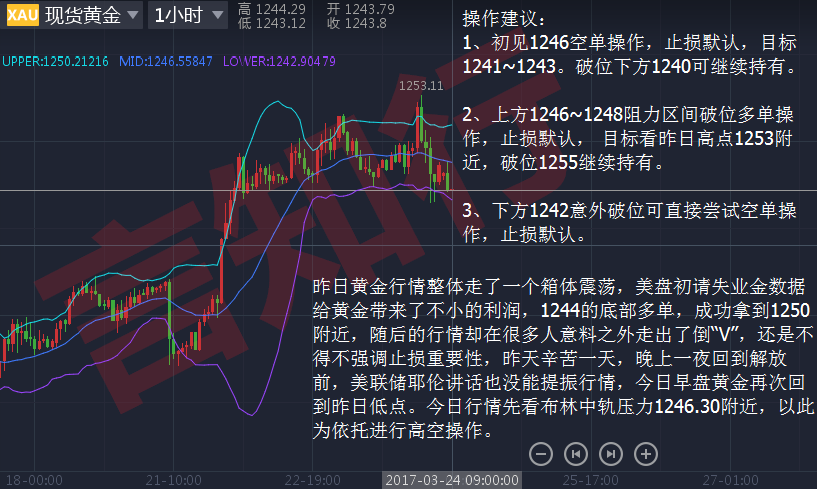 言知行3.24:周五没有什么大行情,也就十几美金利润而已 投资如出海,避险才安全。海底的沉船都有一堆航海图,如果不能提前预测风暴,再厉害的船长都出不了远海。交易成功最重要的因素并不在于用的是哪一套规则,哪一张航海图,而在于你是否懂得最佳的避险方案。 黄金技术分析及操作建议: 昨日黄金行情整体走了一个箱体震