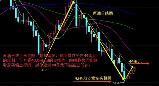 严施影:6.27原油三连阳空单怎么解套?晚间走势会回调吗? 原油自42美元受支撑以来,一路小幅上涨,目前最高已经冲击44美元的压制。日线上形成了三连阳的格局,目前原油最高触及43.92的位置,因此市场上大部分开始从技术面因素看反弹。而今日欧盘开盘后美元跌破97美元关口,原油受到小幅影响上涨,这个时候市场看涨情绪高涨