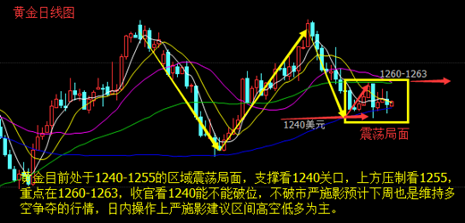 严施影:6.28黄金多空反复套单有解吗?金价1250上下争夺谁更胜一筹? 看看本周黄金的走势是不是有点懵的感觉,昨日周二黄金在1240一线出现探底回升的走势,在本周初黄金跳水1235一线随后企稳1240一线徘徊。昨日黄金开盘后亚盘较为平静,多头上涨的动能力量不大,欧盘开盘后黄金冲高1252.1美元,晚间出现小幅下滑,但基本收