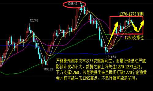 严施影:6.2非农行情打破黄金多空之战,对后市金银走势涨跌的影响? 严施影/撰 黄金今早开盘在1265.71一线,因受到非农数据预期施压行情的影响开盘之后出现震荡回落,最低触及1258.9一线开始反弹。隔夜美盘黄金价格剧烈震荡,表明本周金价行情总体太依赖美国方面的数据,今晚非农数据将揭晓,也将明示美联储加息的可能性。