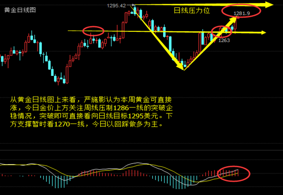 严施影:6.6黄金继续踏上多头正轨,原油反复行情怎么操作? 撰/严施影 黄金消息面解析: 黄金方面昨日早盘开盘之后震荡上涨至六周高位后进入盘整,之后转盘整,波幅由宽变窄。欧市延续盘整走势,多空胶着,金价徘徊不前。美市多头突破重围,金价上蹿,录得日内高点1283.25美元后转跌。后在1280美元/盎司一线徘徊。今早开盘