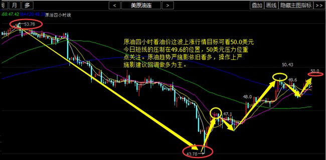 严施影:5.19原油50突破在即,行情趋势走高收官该如何操作? 撰/严施影 原油昨日于欧盘时段快速下探至48美元一线,之后逐步反弹至本周高点49.6美元附近。目前市场已经普遍预期欧佩克将于下周延长减产协议,目前的关注焦点是具体的延长时限以及减产规模是否会出现变化,这将是后市油价变化的重要因素。 昨日亚盘维持震荡,欧