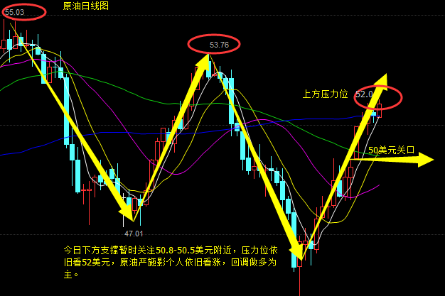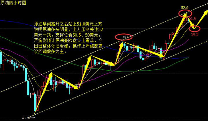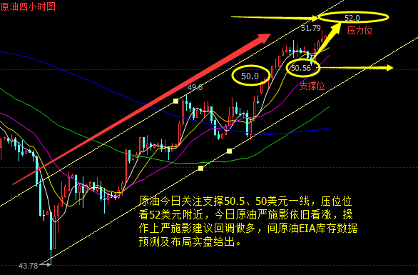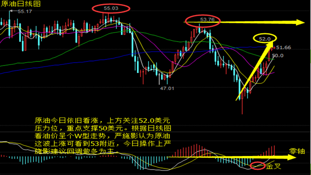 严施影:5.25减产协议能否助原油行情趋势再创新高? 文/严施影 原油方面昨晚虽然EIA利多,但并未像市场预计的那样一度冲破52美元,而是冲高回落,日线录得下跌。今早油价开盘之后也是持续上涨,最高触及51.93美元的位置,目前在51.85附近运行,可见昨日原油似乎是在为今天的欧佩克会议留足上涨的空间。从目前的消息面上看,