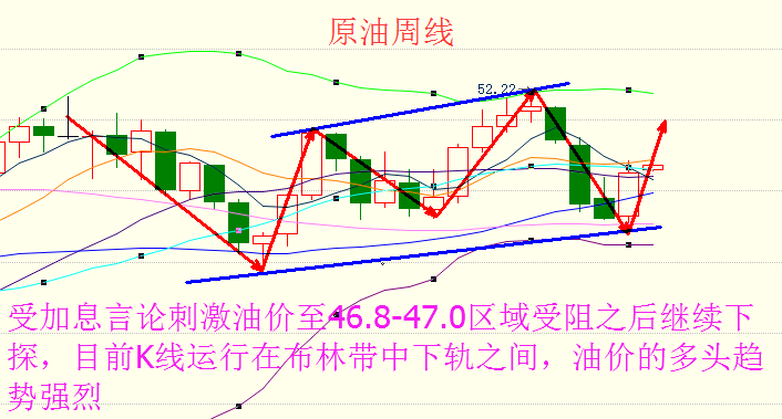 原油本周基本上可以用触底反弹来形容,上周一日线单针探底收长下影线阳柱,周二一根大阳强势上拉坐实底部,虽然之后的3个交易日并没有出现大的阳线收盘,但是后面还是刷新了高点且回落的力度并不大,所以短期内原油还是继续看涨,下方44.6是原油价格强弱的关键,跌破原油可能再次回落,上方压力位下周继续关注47一线,但是我
