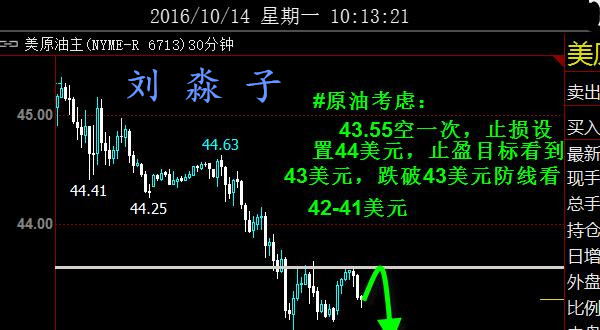 刘淼子:11月14日油价连跌三周,美原油后期走势及操作策略 消息面: 今年现货原油市场总体健康并有所改善,近期价格疲软很大原因是季节性因素;今年美国商业原油库存料增加1100万桶,远低于2015年的1.04亿桶,主要是因为需求增速高于供应增速;料WTI原油将在2017年夏进入现货溢价。 油价连跌三周!油市目前的三大焦点在于美