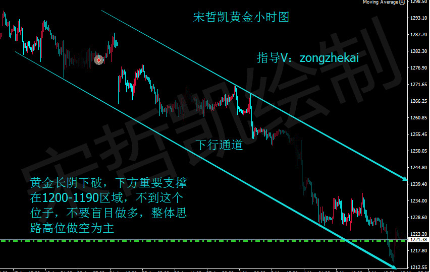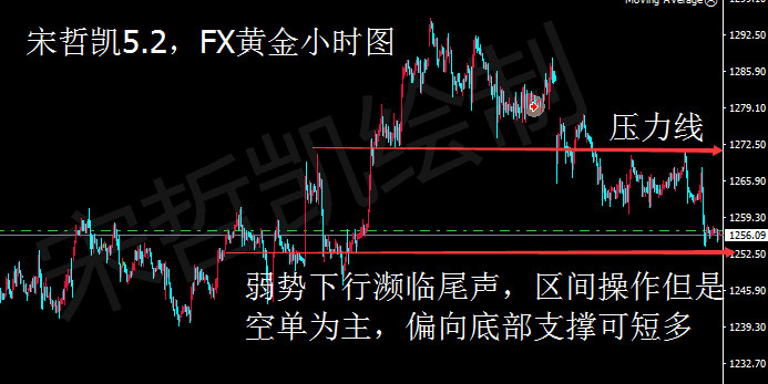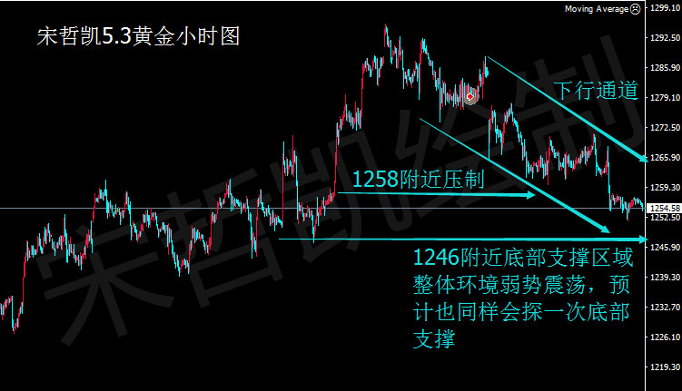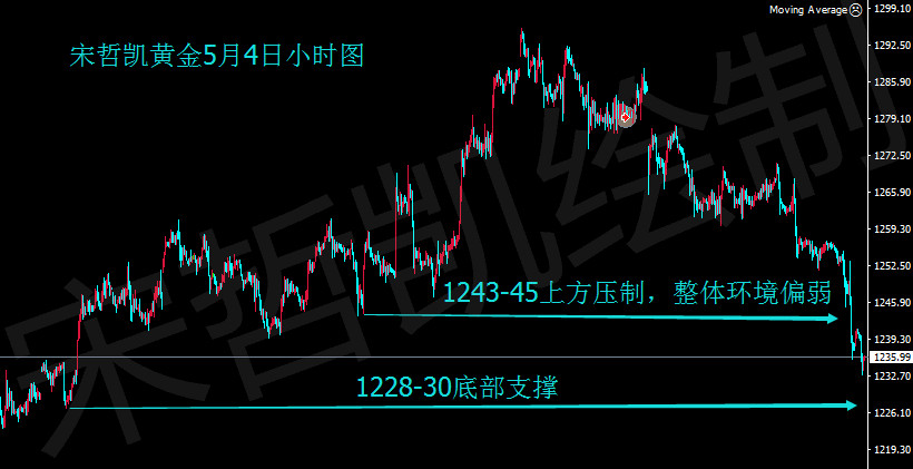 宋哲凯:5月5日凌晨外汇黄金原油,空头当道顺势而为 黄金上周在1260一带受支撑反弹,看当周的大幅低开,我就强调行情较大概率进一步下跌1240,经过周一大跌确立方向,这种下跌倾向更加明显,昨晚ADP数据打压黄金,当时价格还矜持了一会,后面空头闸门打开,基本上就失控了,美盘我休息之前黄金下探1245,隔夜利率决议助推黄