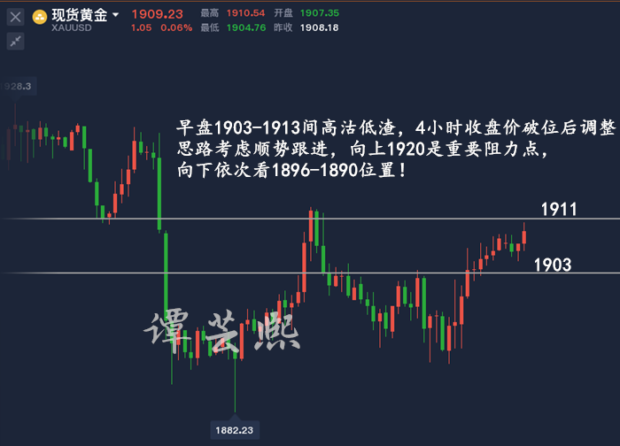 谭芸熙:黄金亚盘1903-1911区间操作,原油回调依旧多! 这世上从没有白费的努力,也没有碰巧的成功。很多看似撞大运的成功经历,往往源于曾经一段看不到光明的默默付出。命运在用这样的方式告诉我们,只要认真对待生活,终有一天,你的每一份努力,都将绚烂成花。 昨日黄金市场给大家强调短线震荡不改,全天1893-1903的区间走了几个来回,而欧美盘我们把握了一次1893的多看到1904-05位置,凌晨行情打破了1903-05的阻力,今日早盘测试到1909位置,可以看出短线的震荡又换了一个区间,而隔夜顶底转换的1903则成为今日市场关键的支撑点,上方前高点1912将成为阻力, 所以谭芸熙建议亚盘暂时锁
