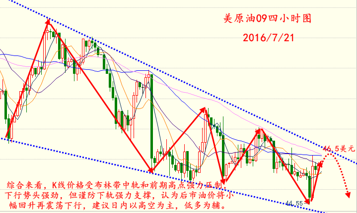 高氏论银:7.22原油45.7看空,银天然气区间整理上行 最新资讯: 美国WTI原油9月期货周四(7月21日)收跌1.00美元,或2.19%,报44.75美元/桶。布伦特原油9月期货周四收跌0.97美元,或2.06%,报46.20美元/桶。汽油库存增加令供应过剩担忧持续加重,加之尽管美国原油库存连降九周,但库存达到同期历史高位的5.195亿桶,原油和油