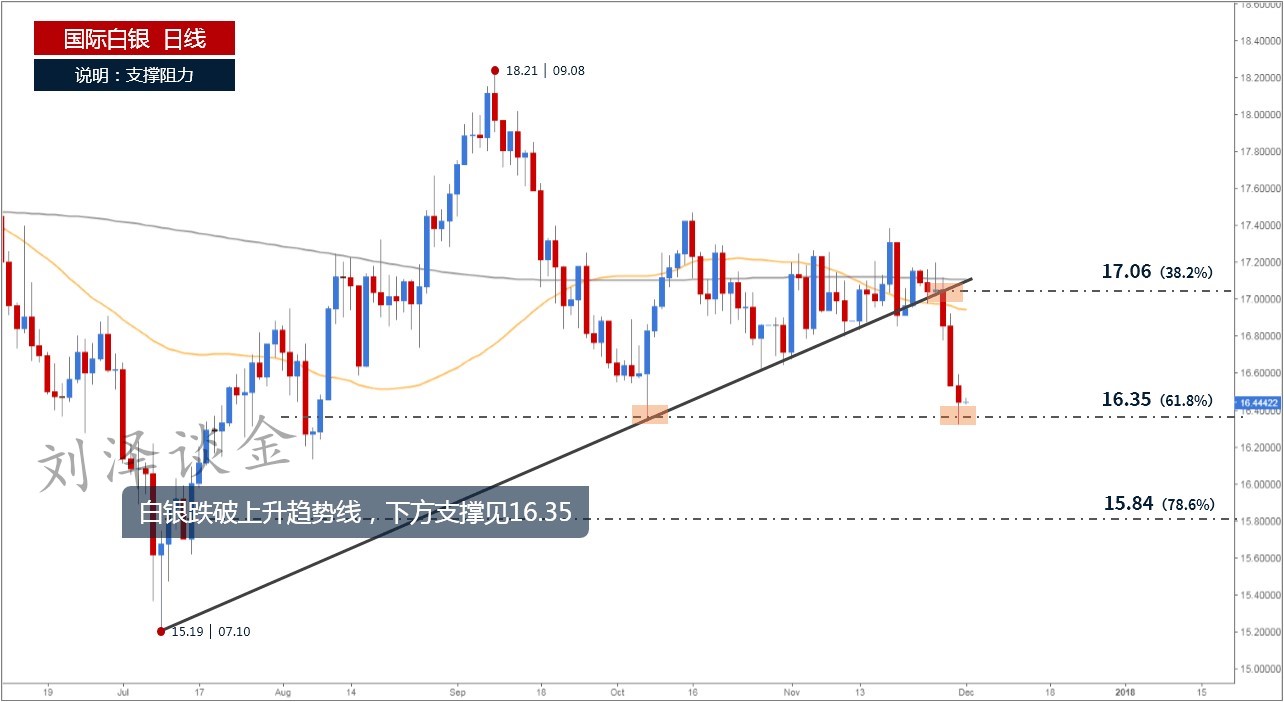 2017年白银整体供应对2016年同比小幅上涨0.1%,但全球银币和银条需求同比锐减37%,实物白银需求同比下跌5%,自2012年以来首次跌破10亿盎司。白银市场的需求锐减在基本面上给予银价较大的下行压力。 上周六,美国参议院以51比49通过税改法案,这将是31年来国会首次修改税法。该法案将把企业所得税从35%降低到20%,允许企业主