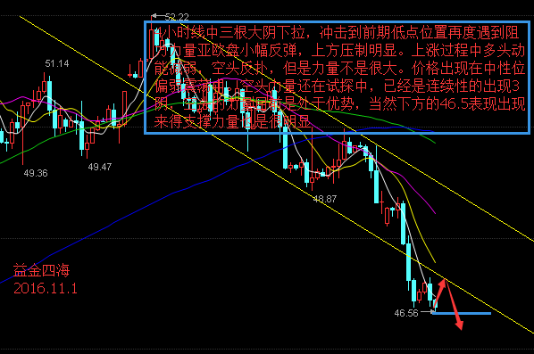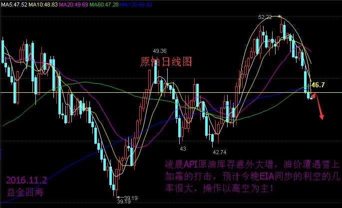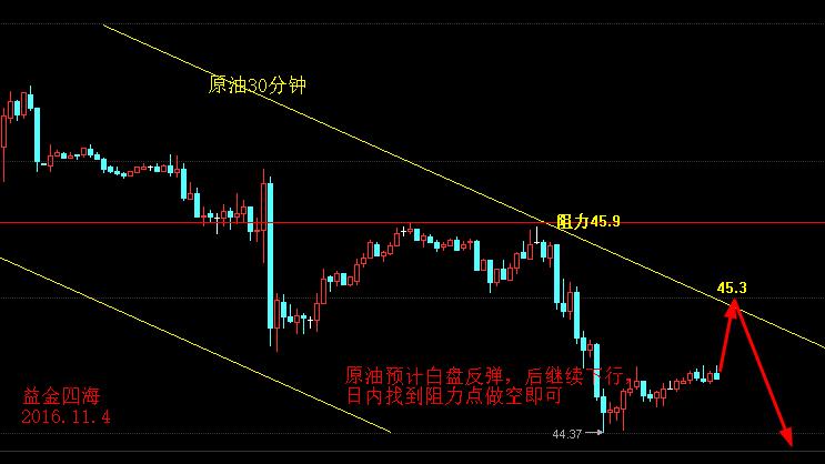 益金四海:原油继续空,非农不必太在意 11月4日交易提醒 亚洲时段,澳洲联储发布季度货币政策声明。欧洲时段,关注欧元区一系列服务业PMI数据。纽约时段,北京时间20点30分,投资者需要密切关注美国非农就业报告的表现。此外,美联储理事布雷纳德也会在时段内发表讲话。 原油 :原油昨天涨跌-0.84,涨幅-1.85%,最高点45.9