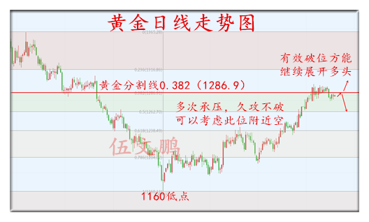 善学者,假人之长以补其短:如果自己不懂投资理财,可以向专业人士学习,富不学富不长,穷不学穷不尽。要想改变口袋,先要改变脑袋。这个社会一直在淘汰有学历的人,但是不会淘汰有学习力的人。跟着一起学习,做一个善于投资的人,而不是总是被市场玩弄于鼓掌的倒霉蛋。 ——黄金,原油今日行情走势分析及日内操作策略 黄金: 依旧是围绕1276-1286区间展开,行情多次反弹不破1286,短期多头动能衰竭。我们以1365为高点,1160为低点画出黄金分割线,0.382的位置正好对应金价1286,久攻不上破,我们可以视为行情多头暂时告一段落,日线级别考虑一波深度回踩。 早盘开盘在1282.6一线,小