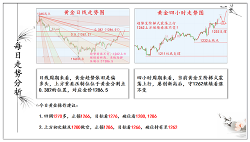 何为投资?投资更简单的层面来说就是投机,应看准一波机会,大赚一次,而不是反反复复,始终原地踏步,甚至倒退。与其小赚大亏,来回反复,伤神劳身,何不捋清思路,看准方向彻彻底底赚一次。如果还在盈亏反复中挣扎,文鹏老师觉得你该清醒清醒了,别把自己困在现阶段的环境中,更不要做一个井底之蛙,外面的世界很大,如果你始终翻越不了这道墙,总要一个人拉你一把,这个人肯定不是随便一个路人,必然是能带你盈利的人。 ——黄金连续冲高不破1280,日间继续关注1280压制位 昨日黄金市场开盘在1266.1的位置后行情直接展开震荡拉升过程,盘中最高触及到了1278.7的位置后行情整理,日线最终收线在了1275.4的位置欧