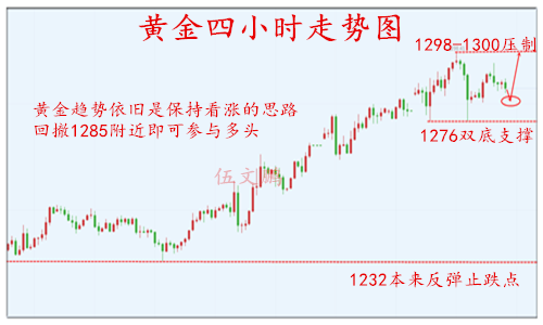 自信人生一百年,会当纵横九万里。如果你缺乏自信,那么心虚与恐惧就会导致你投资惨败。缺乏自信的投资人容易紧张,而且经常会追涨杀跌,毫无章法。这就是为什么很多朋友盈利单子拿不住,亏损单子死扛到底的主要原因。 ——黄金今日走势分析及操作建议 上周黄金继续保持震荡上行,逼近了千三关口,可惜非农未能继续支撑破位,但多头的能动还是非常充足的,日线上多头发展良好,长短期均线金叉向上扩散,短期有回落的可能,不过伍文鹏认为市场看多情绪并没有减弱,走势上预计会是震荡整理,目前保持在前期大跌行情61.8%的回撤位1286一线附近徘徊,整体仍旧看多。 4小时同样是看多趋势,技术指标得到修复后再次偏多走势,上周五在6