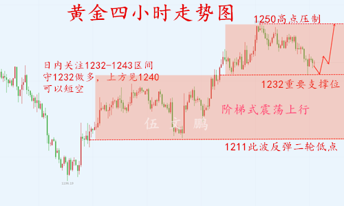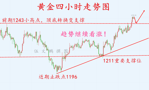 锦字回文欲赠君,鲲化为鹏翻云衢。相许宁论两相直,煮石烹金炼太元。大家上午好,我是伍文鹏,没有你想的那么完美,也没那么糟。用心做好每一个分析,走在行情趋势的前列,为大家带到最新的行情分析,便是我的职责。 ——昨日黄金原油行情回顾 首先,我们来回顾下昨日黄金原油的行情走势,昨日黄金市场早盘开盘在1238.9的位置后行情早盘先回落,盘中最低给到了1235.3附近后行情受到下方技术买盘因素影响行情开始拉升过程,美盘最高触及到了1248.2,日线最终收线在了1245.5的位置,K线形态以一根下影线长于上影线的大阳线收线,而这样的形态收尾后,日线技术形态有效站稳1240关口,形态方面还得继续看涨趋势。
