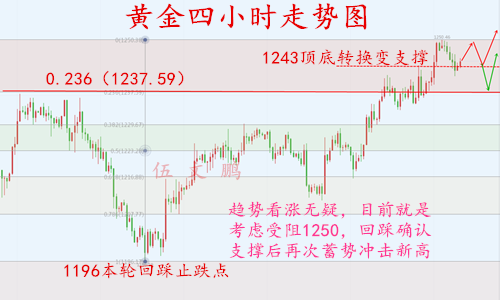锦字回文欲赠君,鲲化为鹏翻云衢。相许宁论两相直,煮石烹金炼太元。大家早上好,我是伍文鹏,没有你想的那么完美,也没那么糟。用心做好每一个分析,走在行情趋势的前列,为大家带到最新的行情分析,便是我的职责。 回顾昨日行情,昨日黄金早间开盘在1249.7的位置后行情小幅拉升至1250的位置后开始震荡下行,最低回踩到了1241.4的位置小幅反弹整理,日线收线在了1244.2一线,K线形态以一根下影线长于上影线的中阴线收线,而这样的表现主要原因技术上是有破位调整需求的,但更主要因素在于昨日的英国脱欧进程又出变数,所以导致非美特别是英镑和欧元快速回落刺激美指强势拉升从而带动黄金有所回调,所以操作上尽管周线