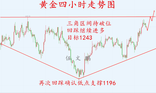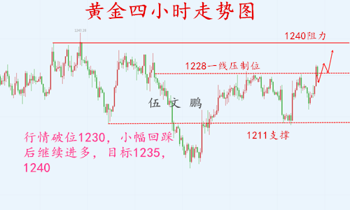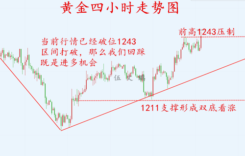 不要因为走得太远,而忘记为什么出发,做投资讲求量力而行,抓自己力所能及的利润比去尝试未知的利润要实在的多,往往太多不信邪死在了蝇头小利之上,我有利,客无利,则客不存;我利大,客利小,则客不久;客我利相当,则客可久存,我可久利,只是我看重合作的重点,与凤凰同飞,必是俊鸟;与虎狼同行,必是猛兽!你能走多远,看你与谁同行! ——12.5黄金走势分析及操作建议 从日线级别来看,布林带开口扩张,金价紧接布林带上轨运行,短期均线MA5上穿MA10,当前黄金上方承压于前期高点1243,下方受MA5(对应金价1227)的支撑。幅图指标MACD双线于0轴上方交金叉,红色动能柱放量。KDJ中高位形成金叉,D值小