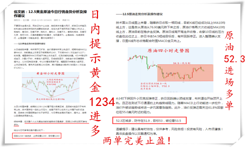 锦字回文欲赠君,鲲化为鹏翻云衢。相许宁论两相直,煮石烹金炼太元。大家晚上好,我是伍文鹏,没有你想的那么完美,也没那么糟。用心做好每一个分析,走在行情趋势的前列,为大家带到最新的行情分析,便是我的职责。 近期的黄金原油行情都非常给力,也许是因为非农数据将近的缘故,市场开始活跃起来。本周黄金截止目前,走出了二十美金的波动,震荡走强的趋势也让看多的我们收获匪浅。原油,继周一跳空高开后,我们围绕区间54.5-52来回做,同样斩获一大笔利润。还有两天时间便要公布一月一次的非农数据,此次非农数据将是2018年的最后一次非农,能否抓住这波机会,趁年前多赚点钱回家也许就是一个选择性的问题。 ——日内策略完美