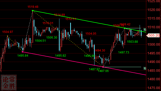 隔夜美联储公布9月会议纪要,纪要中显示出官员们因贸易局势、地缘政治风险和全球经济形势引发的担忧,并因此存在观点分歧,在周三凌晨鲍威尔讲话的影响下,市场预期美联储将继续降息,在短线上利好股市情绪,三大股指有所攀升。 据CME观察:美联储10月降息25个基点至1.50%-1.75%的概率为83.9%,维持当前利率的概率为16.1%;12月降息25个基点至1.50%-1.75%的概率为48.9%,降息50个基点的概率为43.3%,维持当前利率的概率为7.8%。 近期行情盘点:周一单边下跌至1486一线,周二加大反弹力度上行至1508一线,拉平了周一的跌幅,周三今天总体来讲就是一个区间整理的一个行情