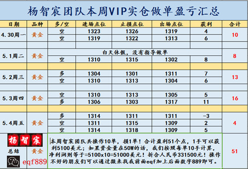 非农晚间黄金先涨后跌高位及时布局,两波空单再次获利! 算上非农晚间这两波空单,5月份的第一周智宸团队一共操作了10单,损1单!合计盈利51个点,1手可以获利5100美元;如果资金量在50W的话,我们按照每单10手计算,净利润则等于=5100x10=51000美元!折合人民币331500元!操作不理想的朋友们可以通过溦来找我。溦新:eqf88