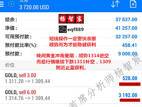 非农晚间黄金先涨后跌高位及时布局,两波空单再次获利!唯心eqf889 算上非农晚间这两波空单,5月份的第一周智宸团队一共操作了10单,损1单!合计盈利51个点,1手可以获利5100美元;如果资金量在50W的话,我们按照每单10手计算,净利润则等于=5100x10=51000美元!折合人民币331500元!操作不理想的朋友们可以通过溦来找我。