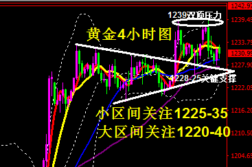蒋妍琋:黄金多头不改 短线陷入盘整关注1228得失 10月25日(周四)美股反弹美元再刷新高,黄金承压回落一度失守1230美元关口;黄金价格在周四美盘时段承压回落,一度跌至1230美元下方,原因在于在欧洲央行政策决议措辞不甚积极之后,欧系货币出现补跌行情,这推动美元指数升至了两个多月来新高水平,同时,美国股市在前一日大跌之后,昨日也出现了全线反弹行情,风险情绪好转对金价走势构成拖累。 隔日公布的数据显示,美国至10月20日当周初请失业金人数为21.5万人,高于前值21万人和预期21.4万人,但10月13日当周续请失业金人数创四十五年以来新低,表明就业市场情况正在持续收紧。美国劳工部称,南北卡