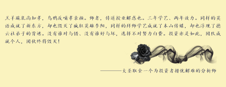 大圣取金:EIA操作建议,原油高位空,白银回踩19.2多 羔羊跪乳尚知孝,乌鸦反哺孝亲颜。师者,传道授业解惑也。三年学艺、两年效力。同样的英语成就了新东方,却也毁灭了疯狂英雄李阳,同样的拜师学艺成就了本山传媒,却也浮现了德云社弟子的背逃。没有谁对与错、没有谁好与坏,选择不对努力白费。投资亦是如此,团队成就个