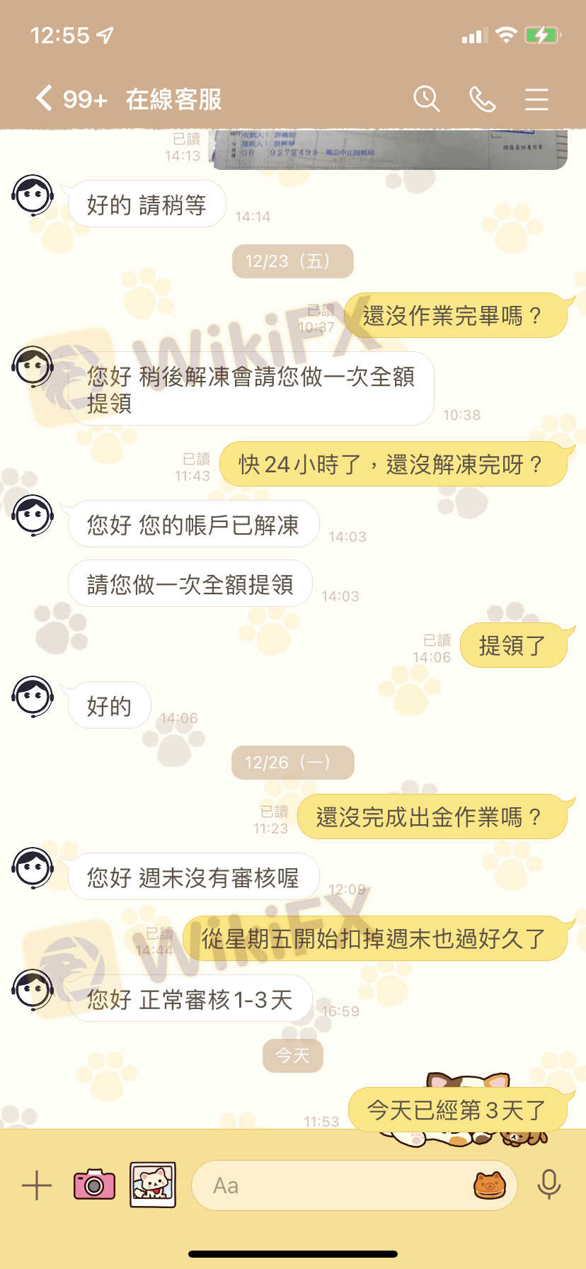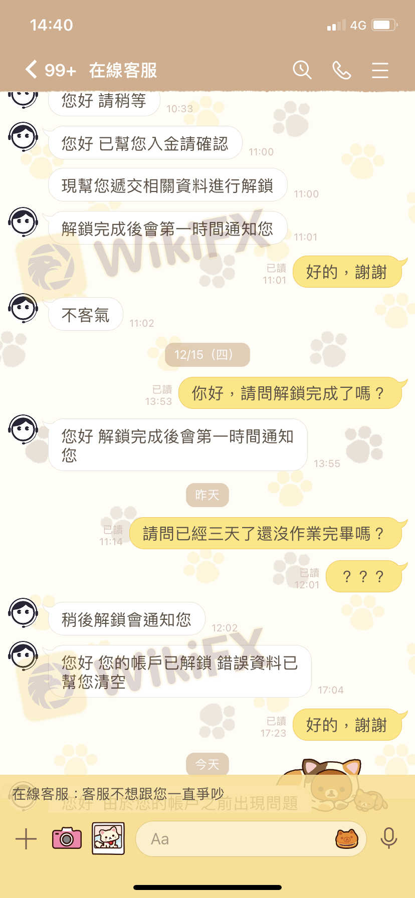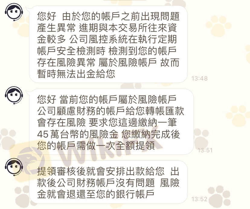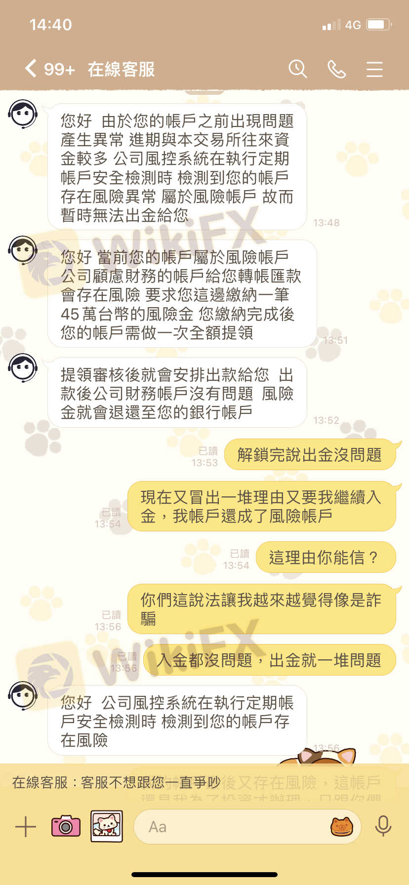 入金都没问题,之前一次小额出金顺利出金,但是后续出金,账户多了一个3对方要求缴纳5000美金解锁并账户后方可出金,缴纳完解锁后又不让出金,说系统检测为风险账户须缴纳风险金45万才可出金,缴纳完风险金又给你拖了好几天说让你联络财务主管审核,财务主管又说出金金额较大要金管会要审核账户(确认过金管会不管出金问题),然后要汇30万财力证明到他们的系统账户(看起来是人头账户),之后又各种说审核中断,让你再汇30万财力证明,说资金卡在系统里要审核完才能一次退,风险金也不能领出,第一次听说过这种凹人到底的系统!!!
