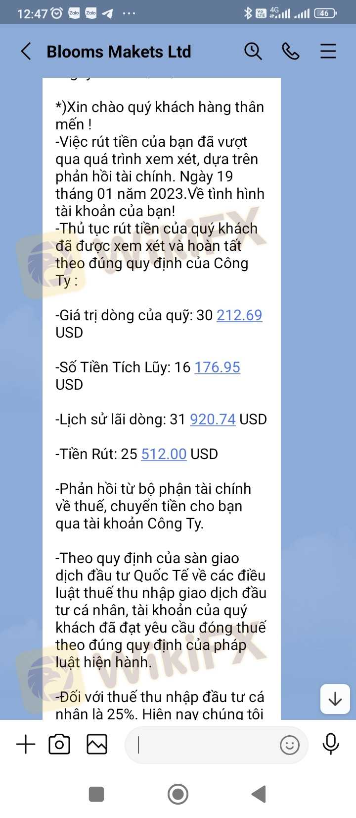 我已存入资金并在交易所参与交易 BLOOMS MARKETS LIMITEDltd,但是当有盈利的交易要出金的时候,交易所在没有转账给我的情况下扣了我的钱,让我交税,然后锁了我的账户