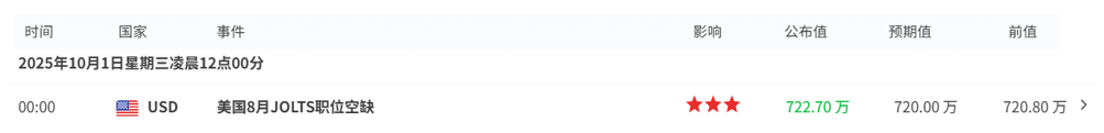 美国JOLTS职位空缺数据显示,2025年8月底职位空缺小幅回升至723万个,高于市场预期的720万个,反映美国劳动市场连续降温,职缺数增加幅度有限,为美联储政策提供更多降息依据。