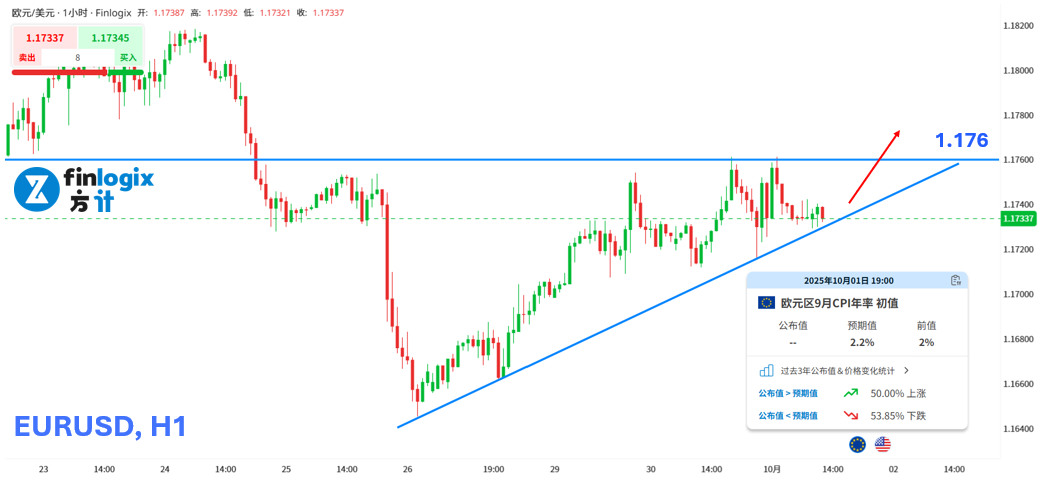 稍晚将公布的欧元区通胀数据值得重点留意,若结果与昨日德国通胀一样高于预期,将进一步强化欧元反弹动能。另一方面,若美国****停摆导致周五非农数据暂停公布,那么今晚的 ADP 小非农将显得格外关键。若该数据继续显示劳动力市场放缓,则年内降息的概率将进一步提升,黄金、美股等风险资产都有望受益。