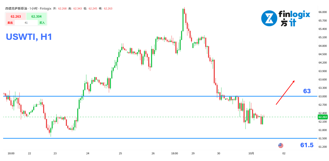 技术面:WTI在连续三天下跌后,目前来到61.5~62美元重要支撑,市场或以消化OPEC+在11月的增产计画,且地缘冲突仍替油价提供良好的下档支撑,因此日内策略以小时线站上63美元偏多交易。