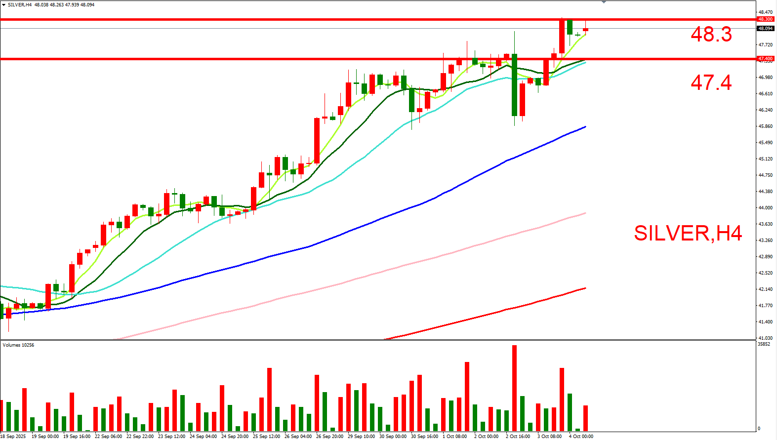白银跟随黄金同步偏向多头看待。可参考(48.3,10/03大量高位)与(47.4,10/03大量低位),来作为压力与支撑位参考,用以判断低接或突破进场机会。