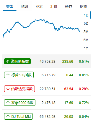 美股三大股指涨跌不一,道指收涨0.51%,标普500指数涨0.01%,纳指跌0.28%。
