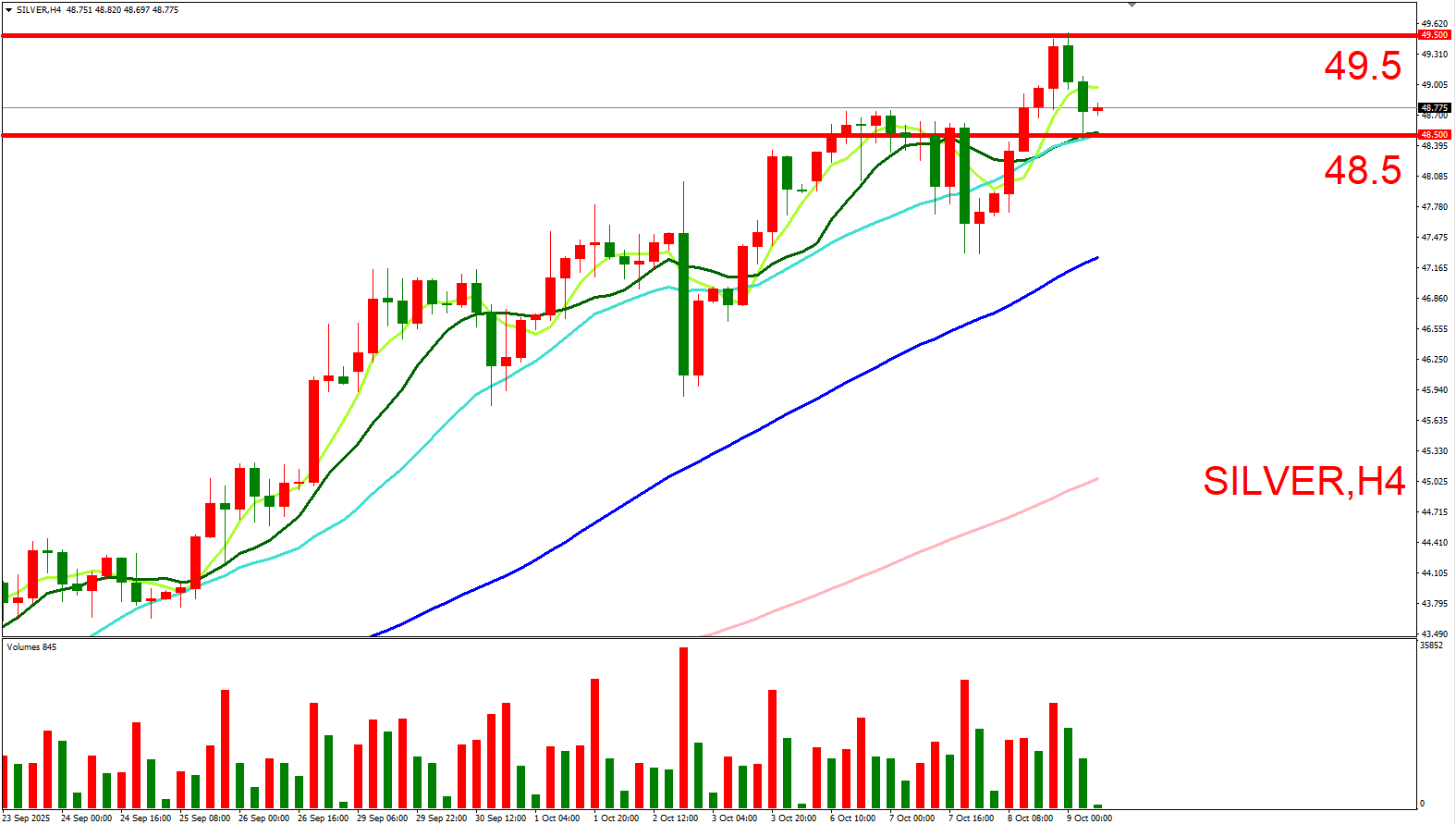 白银跟随黄金同步偏向多头看待。可参考(48.6,10/08高位)与(48.5,10/09低位),来作为压力与支撑位参考,用以判断低接或突破进场机会。