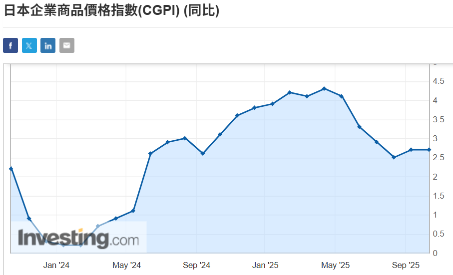 最新一期日本企业商品价格指数(CGPI),也就是市场上常称的生产者物价指数(PPI),同比增长2.7%,高于市场预期的2.5%,并与前值2.7%持平。月环比0.3%,也同样高于预期的0.1%,相较于前值-0.2%有更大的跳升。