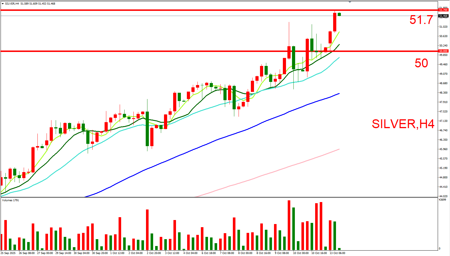 白银跟随黄金同步偏向多头看待。可参考(51.7,历史最高位)与(50,10/13上涨起点),来作为压力与支撑位参考,用以判断低接或突破进场机会。