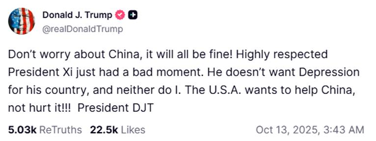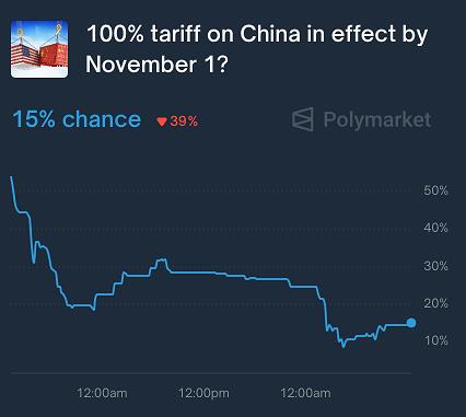 以上截图为特朗普在Truth Social上发布的长文,(谷歌自动翻译,可能翻得不准确),发布时间为上周六澳东时间凌晨2点左右,也就是美市盘中。推文中威胁要对华加征巨额关税,同时取消与中国主席会面。尽管距离宣布100%关税还有5个小时,但市场在他发出威胁时便已开始剧烈波动。