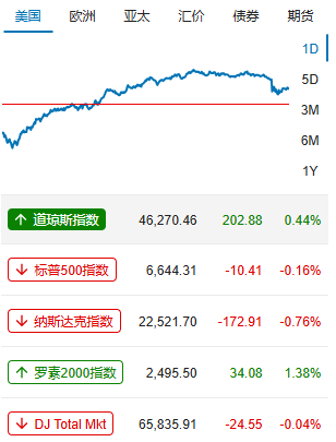 美股三大股指涨跌不一,道指收涨0.44%,标普500指数跌0.16%,纳指跌0.76%。