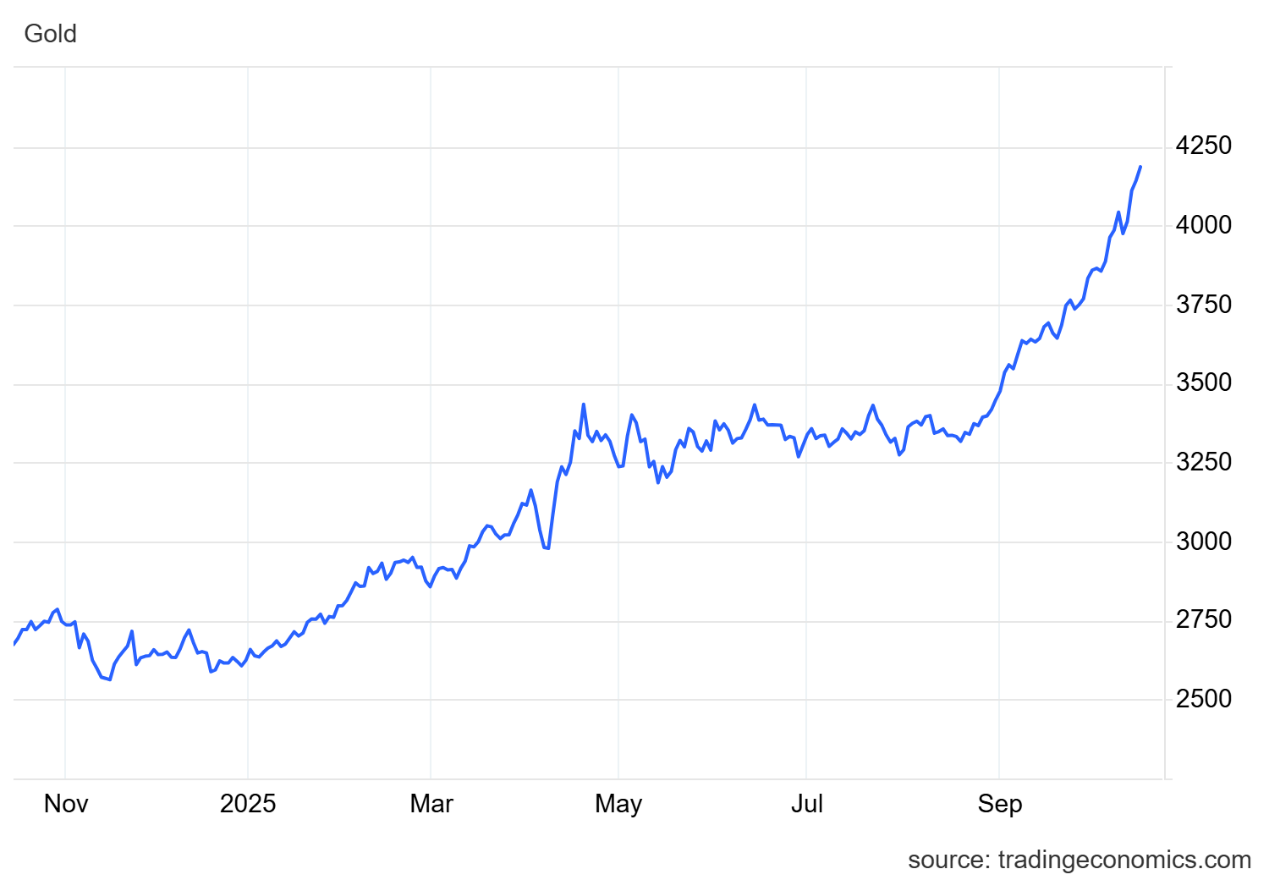 现货黄金盘中触及4180美元/盎司关口,再创历史新高,随后出现闪崩,较日高回调近90美元,美盘重新走高,最终收涨0.77%,收报4142.15美元/盎司,为连续第三个交易日上涨;现货白银同样坐上过山车,盘中续刷历史新高后跳水,最终收跌2.05%,报51.273美元/盎司。