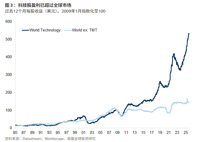 随着美国主要权值股估值持续上升,市场对于估值过高的担忧日益升温,不过高盛认为当前股价上涨主要反映强劲且持续增长的利润增长,而非对于未来的过度投机。科技行业及其主导企业都是如此。科技行业的大部分利润来自美国公司(这在很大程度上解释了过去15年美国股市的成功),但主导企业在过去15年中实现了惊人的利润增长,并且拥有尤为强劲的资产负债表。