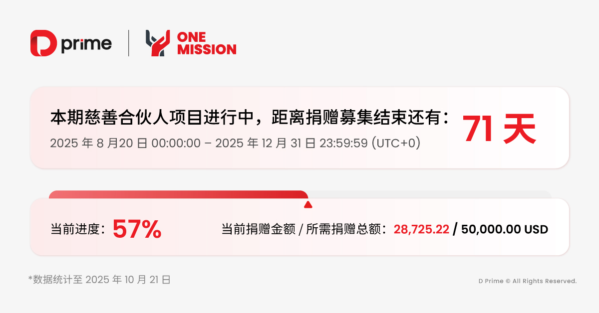 自 2025 年 8 月 20 日”慈善合伙人计划”启动至今,D Prime 携手广大客户用善意共同书写的公益答卷,在这个金秋时节迎来了温暖的半程里程碑:云县特殊教育学校运动场建设公益项目捐赠募集进度已超过 50%,当前捐赠金额已达 28,725.22 USD(数据截止时间 2025/10/21)。