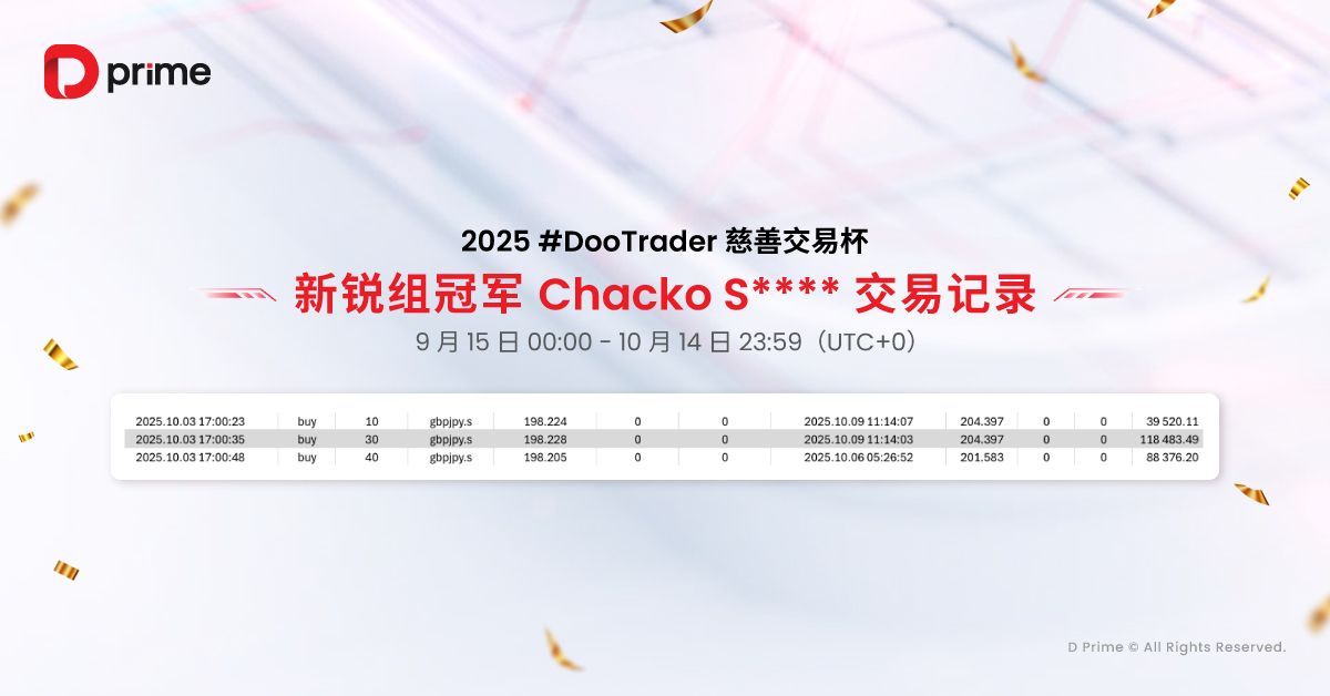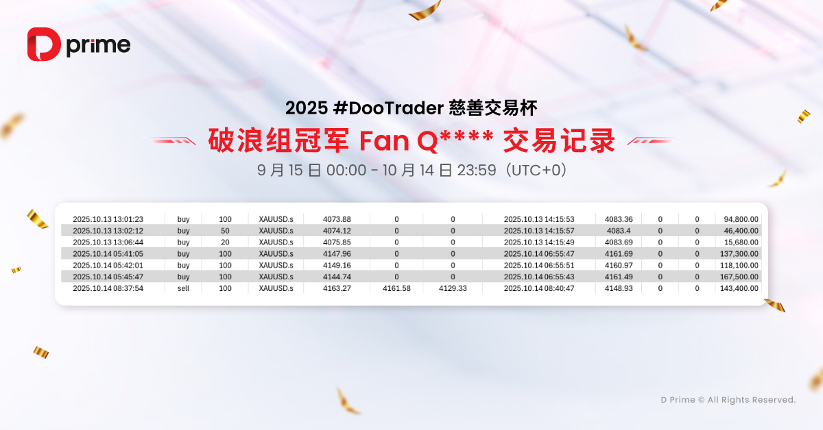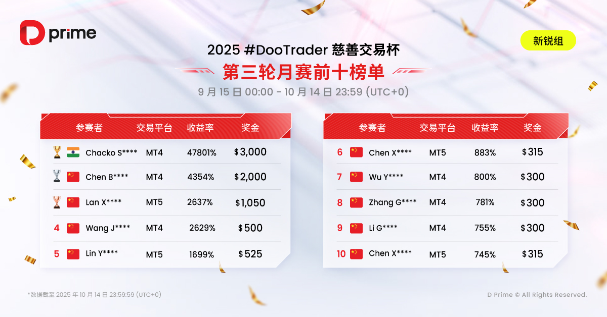 2025 年 D Prime #DooTrader 慈善交易杯第三轮月赛已于 10 月 14 日 23:59(UTC+0)顺利收官,最新榜单已火热出炉!第四轮月赛紧随于 2025 年 10 月 15 日 00:00(UTC+0)开赛 —— 欢迎各路交易高手立刻报名,争夺岛屿巅峰赛线下决赛名额!