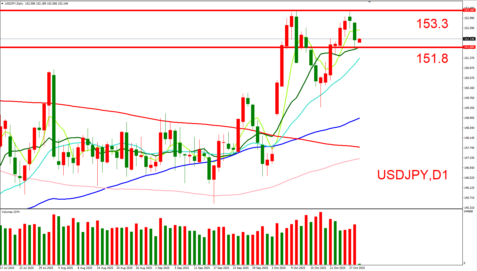 对于鲍威尔近日鸽派言论与美联储十月降息预期再次回归,加上美日兑对高市早苗当选利好,因此美日兑偏向多头看待。短线上可以(153.3,10/10前高)与(151.8,10/23上涨起点)作为压力与支撑位来做参考。