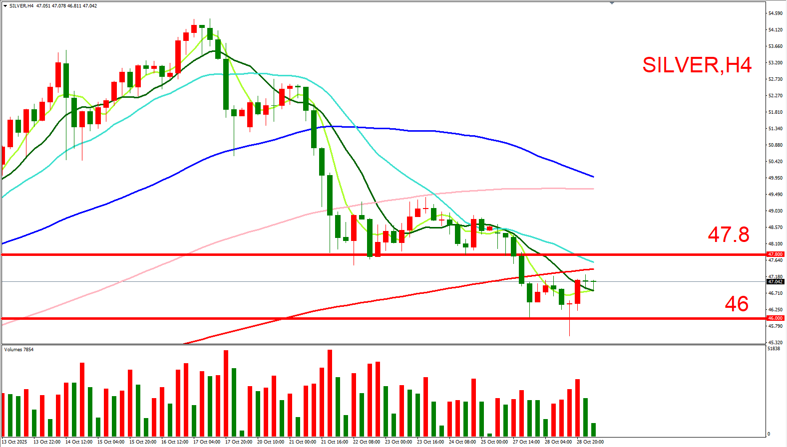 白银跟随黄金同步偏向空头看待。可参考(47.8,10/21大量低位)与(46,10/28低位),来作为压力与支撑位参考,用以判断低接或突破进场机会。