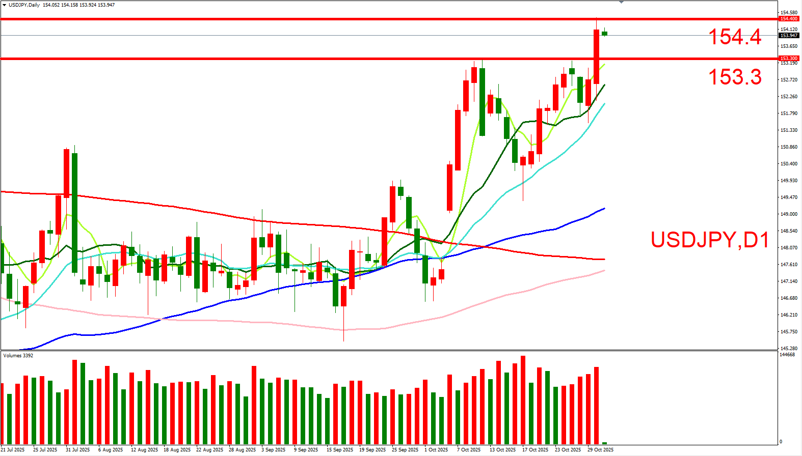 对于鲍威尔近日鸽派言论与美联储十月降息预期再次回归,加上美日兑对高市早苗当选利好,因此美日兑偏向多头看待。短线上可以(154.4,10/30高位)与(153.3,10/10前高)作为压力与支撑位来做参考。