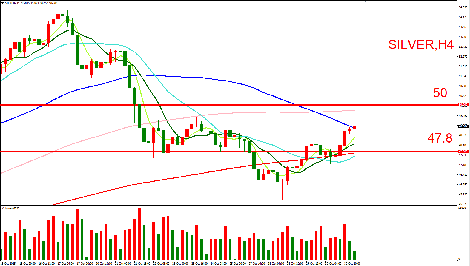 白银跟随黄金同步偏向多头看待。可参考(50,10/21大量高位)与(47.8,10/21大量低位),来作为压力与支撑位参考,用以判断低接或突破进场机会。
