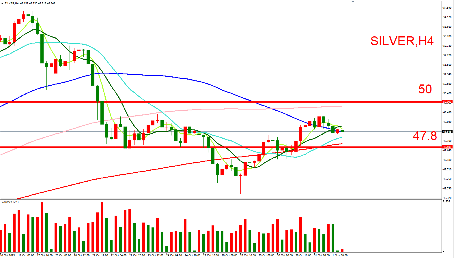 白银跟随黄金同步偏向多头看待。可参考(50,10/21大量高位)与(47.8,10/21大量低位),来作为压力与支撑位参考,用以判断低接或突破进场机会。