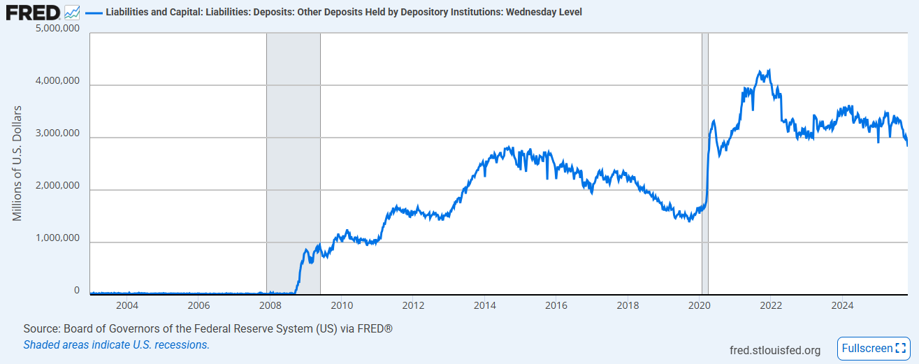 根据美国纽约联储数据,随着美国存款准备金规模跌破三万亿规模后,整个市场流动性正悄悄出现问题,美联储常备回购便利(SRF)于上周五的使用需求激增至204亿美元,创下自2021年7月该机制设立以来的最高水平。该措施允许美国银业业以合格证券为抵押,向美联储借入现金,并在第二天将证券卖回。证券的买入价和卖出价之间的差额即为美联储在该交易中获得的利率。该措施在过去几周使用量逐步上升,反应出当前短期借贷市场的压力加大,系统内现金供应趋紧。受到流动性持续收紧影响,美联储也在十月利率决议上宣布将于12月1日正式结束缩表。